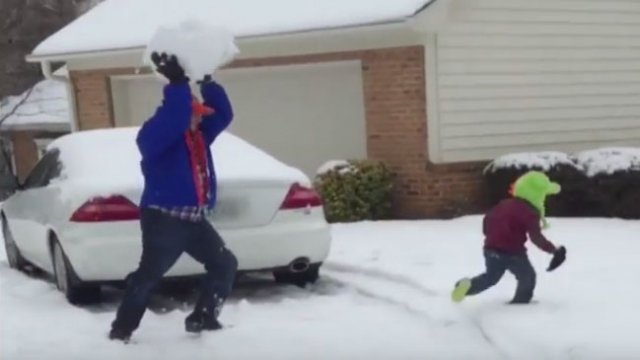 It looks like another perfect day in snow... Dad is playing with son, but suddenly his "great" idea makes him the "savage" father of the year. Oh no, daddy! That snowball was kind of big!